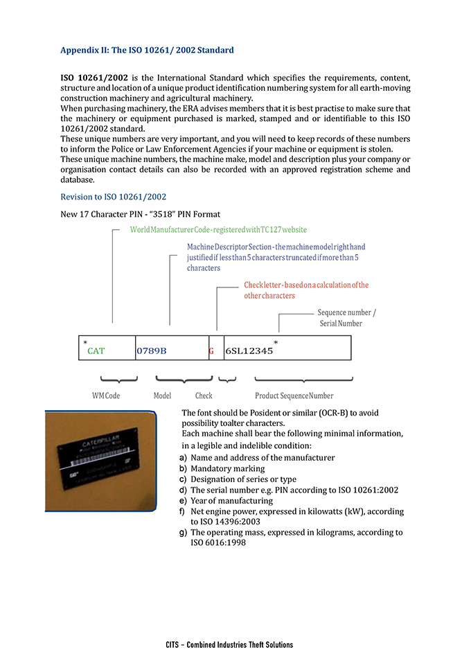 ISO 10261/2002 is the International Standard which specifies the requirements, content, structure and location of a unique product identification numbering system for all earth-moving construction machinery and agricultural machinery.