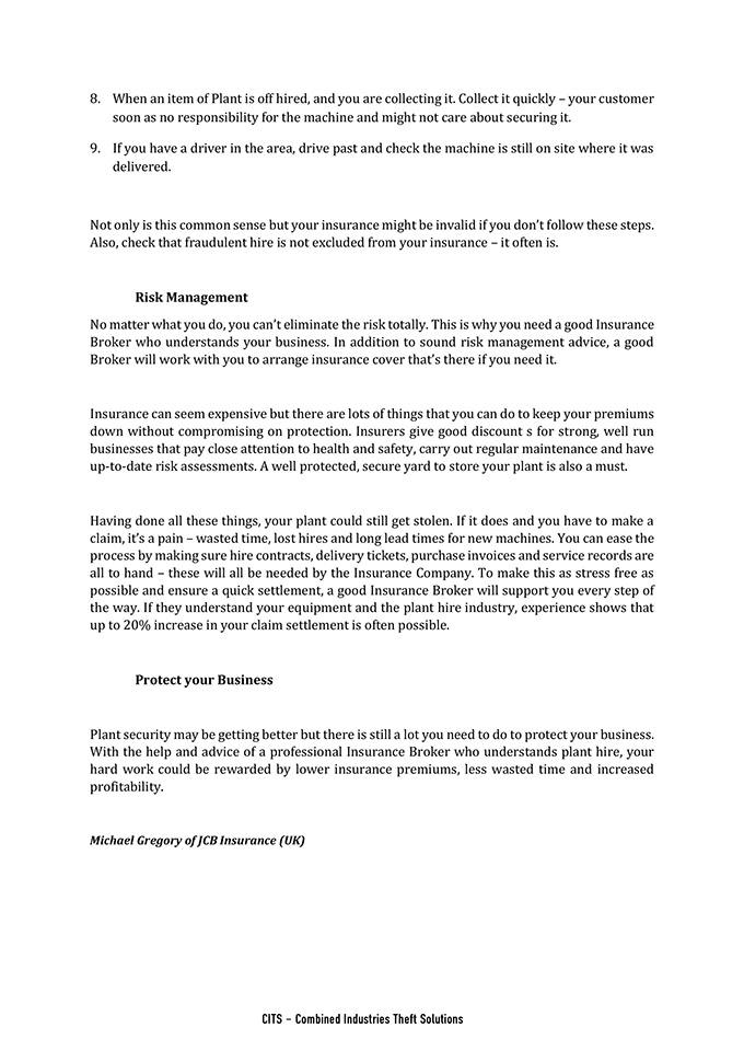 Having done all these things, your plant could still get stolen. If it does and you have to make a claim, it’s a pain – wasted time, lost hires and long lead times for new machines. You can ease the process by making sure hire contracts, delivery tickets, purchase invoices and service records are all to hand – these will all be needed by the Insurance Company. To make this as stress free as possible and ensure a quick settlement, a good Insurance Broker will support you every step of the way. If they understand your equipment and the plant hire industry, experience shows that up to 20% increase in your claim settlement is often possible.
