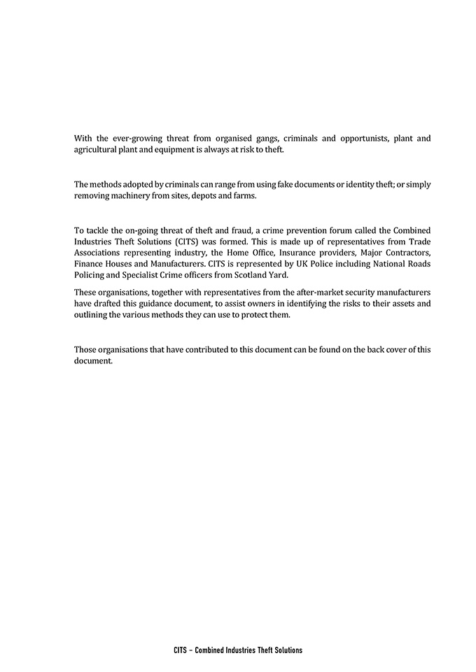 To tackle the on-going threat of theft and fraud, a crime prevention forum called the Combined Industries Theft Solutions (CITS) was formed. This is made up of representatives from Trade Associations representing industry, the Home Office, Insurance providers, Major Contractors, Finance Houses and Manufacturers. CITS is represented by UK Police including National Roads Policing and Specialist Crime officers from Scotland Yard.