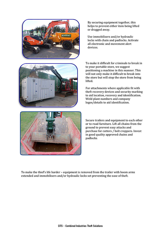 Use immobilisers and/or hydraulic locks with chain and padlocks. Activate all electronic and movement alert devices.