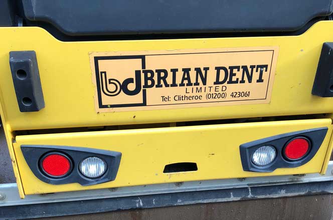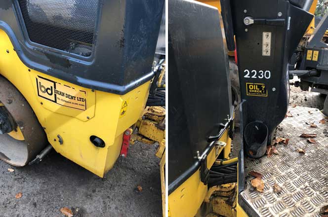 The roller at the time was on hire from Plant and Machinery Hirers, Brian Dent Ltd. The machine has yellow branded stickers on the side and rear.
